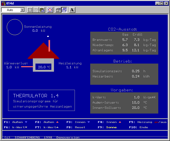 Dargestellt wird eine im Zeitraffertempo (1 Sekunde auf dem Bildschirm entspricht 1 Minute in der Realität) ablaufende Simulation einer witterungsgeführten Heizanlage. Nach Starten des Programms beginnt die Heizung, die voreingestellte Raumtemperatur konstant zu halten, wobei der Heizbetrieb am rauchenden Schornstein erkennbar wird. Wenige, aber wichtige Kenngrößen wie momentane Heizleistung und CO2-Ausstoß, werden ständig aktualisiert und angezeigt (Abb. 1).