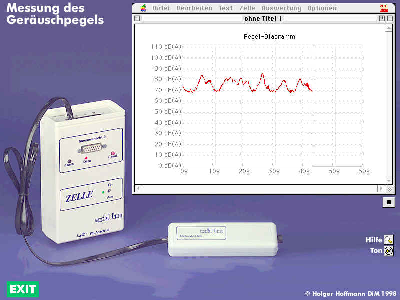 Als Anregung für die Fort- und Weiterbildung ist eine Studie zur Lärmmessung entworfen worden: Interaktive Bildschirmexperimente als Bestandteil eines elektronischen Handbuches. Die Abbildung zeigt das Meßsystem (ZELLE und Lärmsensor) sowie die Benutzeroberfläche der zugehörigen Software ZELLÄRM.