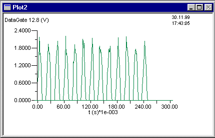 Das zweites Beispiel soll eine etwas komplexere Möglichkeiten aufzeigen. Hier wird das 12-Bit-Interface DataGarte 12.8 (Serai-8/12) wegen seiner extrem hochohmigen Eingänge eingesetzt. Es soll das Störsignal auf einer längeren, ungeschirmten Leitung unter typischen Laborbedingungen untersucht werden. Nur einer der möglichen acht Eingänge des Wandlers wird aktiviert. Das Signal soll einmal wie mit einem Oszilloskop direkt dargestellt werden. Daneben soll aber auch eine Fourier-Analyse durchgeführt werden.