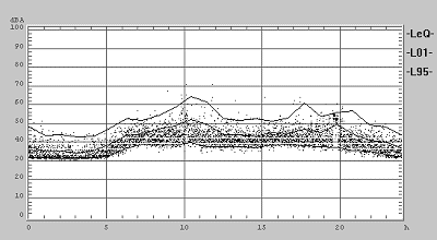 Trägt man L01, L95 und Leq über einen ganzen Tag lang auf, dann lassen sich Aussagen über Umfang und Art der Lärmbelastung machen.
