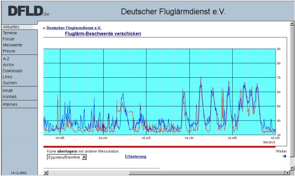 Jeder kann sich die Messwerte aller Messstationen im Internet. unter www.dfld.de/Mess001.html anschauen. Außer einer Tagesansicht kann man bestimmte Bereiche genauer ansehen. Hier werden die oben gezeigten Überflüge gegen zwei Uhr im Detail sichtbar.
