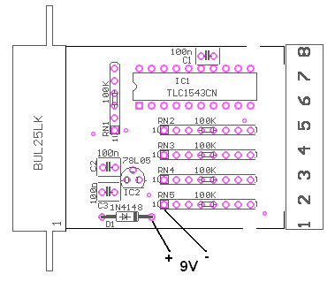 Ob die Spannungsversorgung ausreicht, kann leicht festgestellt werden. An der Klemme 1 des Geräts muss eine Spannung von 5 V liegen. Intern gelangt der Versorgungsstrom von der TXD-Leitung über eine Schutzdiode (Spannungsabfall ca. 0,5 V) und einen Spannungsregler 78L05 (minimaler Spannungsabfall ca. 1,5 V) an den AD-Wandler. Man benötigt also mindestens 7 V an der TXD-Leitung für eine stabile Versorgung. Aus diesem Grunde ist ein üblicher Laptop oft nicht ausreichend. Einige Anwender greifen deshalb auf eine zusätzliche externe Versorgung zurück.