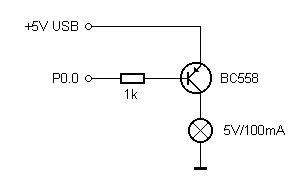 Der neue Chip USBport-2 stellt bei der Initialisierung zuerst den High-Zustand aller Ports her. Dieses Verhalten entspricht dem des Controllers im Reset-Zustand. Von nun an ist also klar, dass Verbraucher in negativer Logik angesteuert werden müssen, ein Low-Zustand soll also den Verbraucher einschalten. LEDs können einfach gegen Vcc angeschlossen werden. Ein einzelner PNP-Transistor reicht aus, wenn ein Verbraucher aus der 5-V-Spannung über den USB versorgt werden soll.