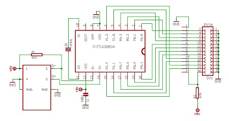 Der bisherige Chip USB-Port auf der Basis des CY7C63001A stellt dem Anwender bereits 12 Ports zur Verfügung, die als Eingänge und als Aushänge benutz werden können. Nach dem Anschluss an den USB werden alle Ports im Low-Zustand initialisiert. Per Software können sie dann eingeschaltet werden. Im High-Zustand ist auch die Verwendung als Eingänge möglich.