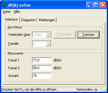 Das dB(A)-online Interface wurde für die Überwachung von Fluglärm entwickelt. Bisher gab es deshalb außer der speziellen Fluglärm-Software nur einfache Beispielprogramme in Visual Basic. Inzwischen wird das Gerät jedoch vielfach auch für andere Zwecke eingesetzt, wie beispielsweise den Lärmschutz in Fertigungsbreichen oder die Messung von Verkehrslärm. Viele Anwender haben deshalb nach einer universell einsetzbaren Software gefragt. Um diesem Wunsch nachzukommen, wurde dB(A)-online entwickelt. Mit dB(A)-online können die vom Interface gemessenen Lärmpegel verarbeitet und aufgezeichnet werden. Es werden ein oder zwei Lärmsensoren unterstützt. Die aufgezeichneten Messwerte können in einem Diagramm dargestellt und in eine Textdatei exportiert werden.