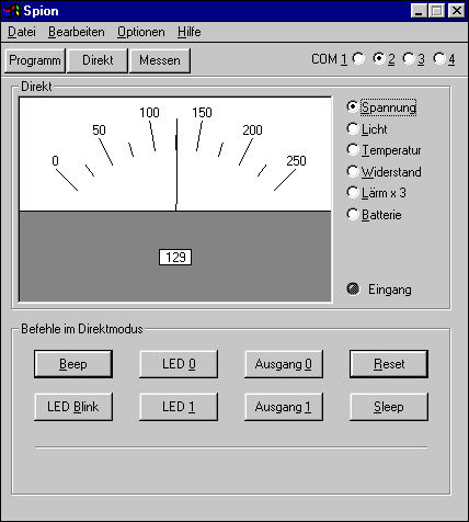 Das Programm Spy hat drei Hauptmenüs: Programm, Direkt und Messen. Beim Start erscheint zunächst das Menü Direkt.