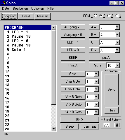 Spion-Basic ist eine sehr einfache Sprache. Man muss sich vor Augen halten, dass nur 64 Bytes im EEPROM des Prozessors zur Verfügung stehen. Was sind 64 Bytes im Zeitalter von Gigabytes! Trotzdem können äußerst sinnvolle Programme erzeugt werden. Die Programmierumgebung des Programms SPY übersetzt kleine Basic-Pro-gramme sehr platzsparend in Tokens, also Zahlen, die für die einzelnen Befehle stehen. Einige Befehle benötigen noch einen Byte-Parameter. Jede Zeile wird also entweder in ein Byte oder in zwei Bytes übersetzt. Insgesamt können Programme also eine maximale Länge zwischen 15 und 31 Zeilen besitzen.